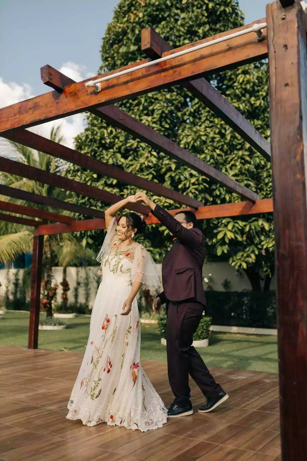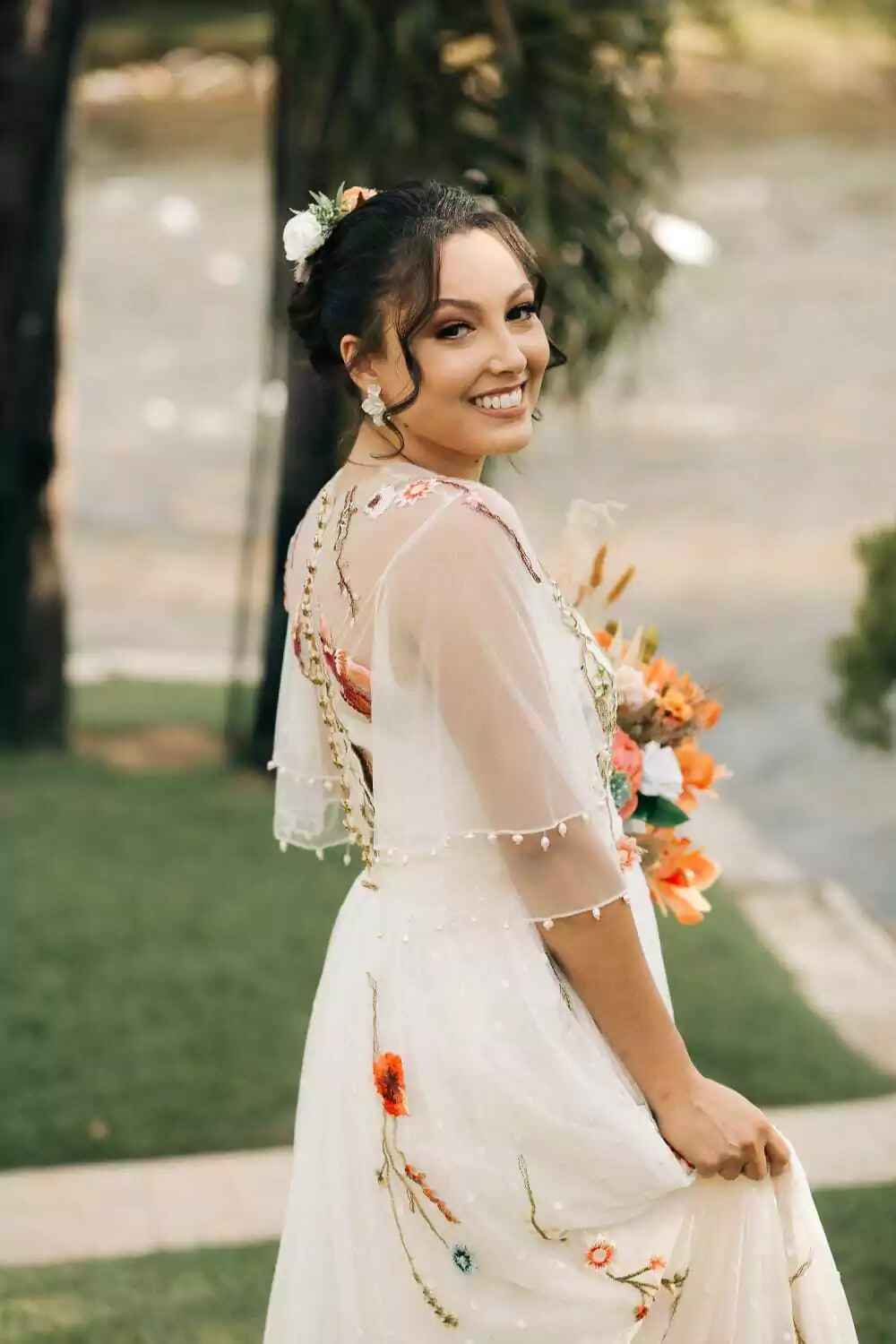 Bolero complementar com mesmos trabalhos de bordados da saia, possibilitando o uso de dois “looks” durante o casamento.